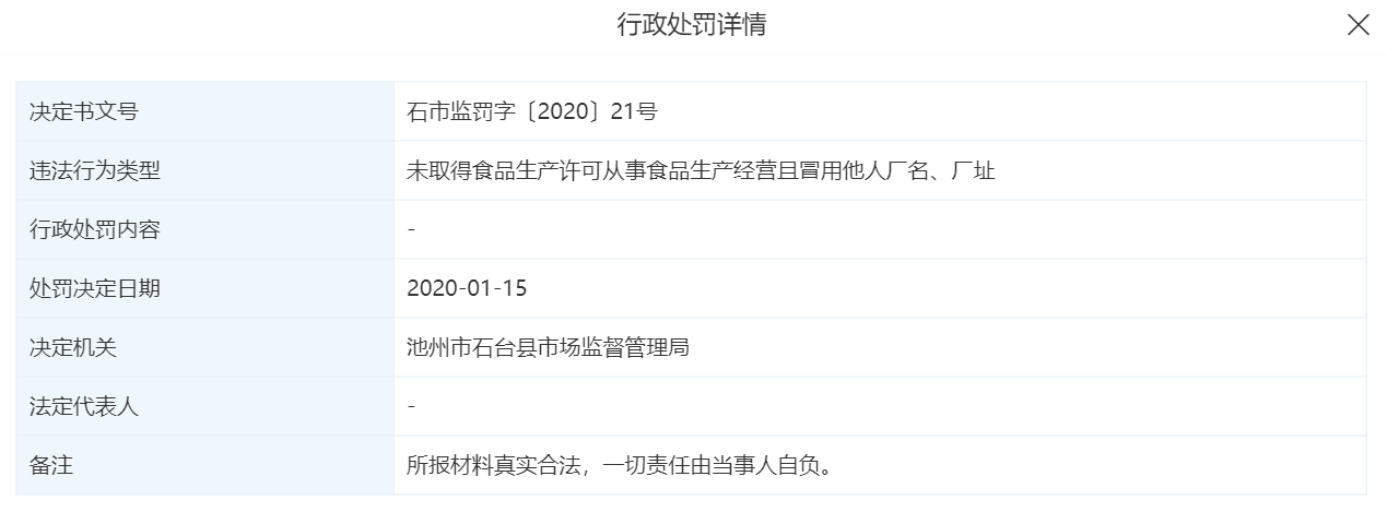 2020年1月15日,被池州市石台县市场监督管理局以“未取得食品生产许可从事食品生产经营且冒用他人厂名、厂址”为由做了处罚通告。此外,安徽护航生态会员商城显示无法打开。