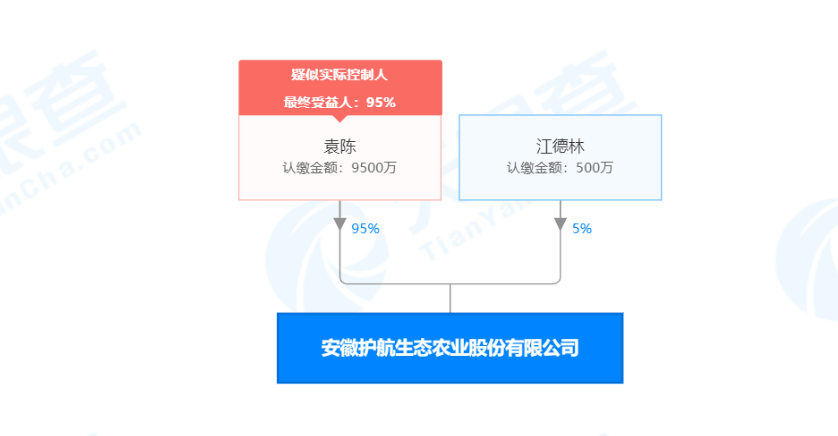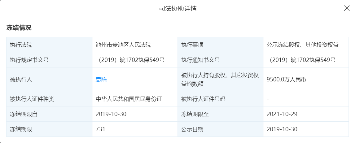 据天眼查显示,安徽护航生态农业股份有限公司注册资本10000万,实缴为0,2019年4月30日成立,法定代表人袁陈担任董事长兼总经理。2019年10月30日,该公司被池州市贵池区人民法院冻结股权、其他投资权益9500万元,冻结期限至 2021年10月29日。
