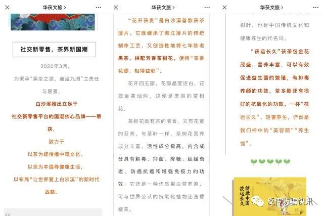 在华茯公司官方公众号也能看到,“華茯”是白沙溪推出立足于社交新零售平台的核心品牌。该公众号在介绍新产品“華茯·花开茯贵”时,称产品具有解毒、降糖、延缓衰老、防癌抗癌、增强免疫力等功效。