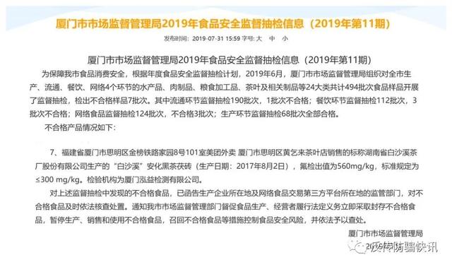 此外,2019年7月31日,厦门市市场监督管理局网站公布的2019年食品安全监督抽检信息(2019年第11期)显示,1批次标称白沙溪茶厂生产的“白沙溪”安化黑茶茯砖检出氟超标,氟检出值为560mg/kg。