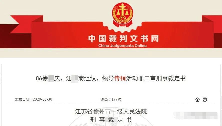 5月14日,江苏省徐州市中级人民法院对一起横跨全国多个省市的特大网络传销案进行了二审宣判。一审期间,“胜威国际”特大传销团伙“中国第一人”徐某庆、汪某菊分别被云龙区人民法院判处有期徒刑,并处罚金。