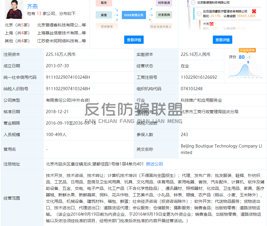 反传防骗联盟从天眼查处获悉,“达令家”的主体注册公司北京普缇客科技有限公司,成立于2013年7月30日,地址位于北京市延庆区康庄镇龙庆望都佳园1号楼1层4单元401,注册资本225.16万元,法人代表齐燕。