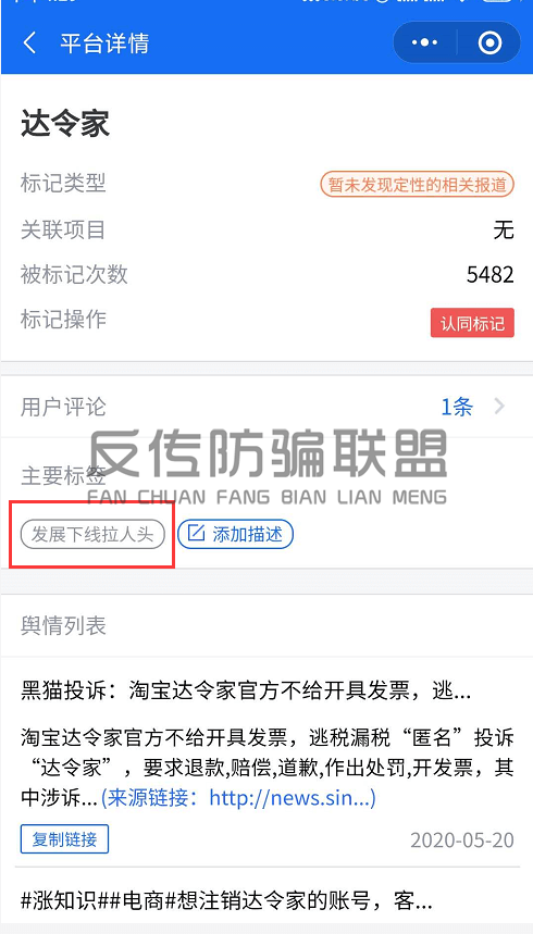 在腾讯平台的灵鲲金融风险查询举报中心,达令家的标记类型虽是“暂未发现定性的相关报道”,但其主要标签有“发展下线拉人头”的字样,且被举报次数高达5482次。