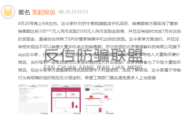 无独有偶,除了售卖假货退货难等问题之外,在投诉平台上,还有网友对其奖励模式产生了质疑,该网友称达令家在未经过用户同意的情况下擅自取消了管家销售达标奖励,该投诉人称“达令家以返利拉人头的形式和高额的销售佣金来诱导他人大师购买廉价商品,当升级到一定级别就可以享受所谓的佳人计划奖励,当众多消费者为了升级大量购买品后达令家却单方面取消奖励。”“达令家有明确的组织规划及分层返利属于传销行为,希望工商部门查实避免更多人上当受骗。”该投诉网友说道。