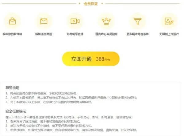 珍爱网提供了“诚信认证”的选项,但并未强制实名认证。注册完成后,记者可以直接向附近女性打招呼。但要进一步发送和接收消息,还需开通388元一年的“珍心会员”服务。只有会员才可享受解锁收件箱、解锁消息发送等权益。而会员服务说明中也并没有要求实名,交钱就可一键开通。但界面下方,珍爱网设置了“安全征婚提示”,让消费者提高警惕,谨防受骗。