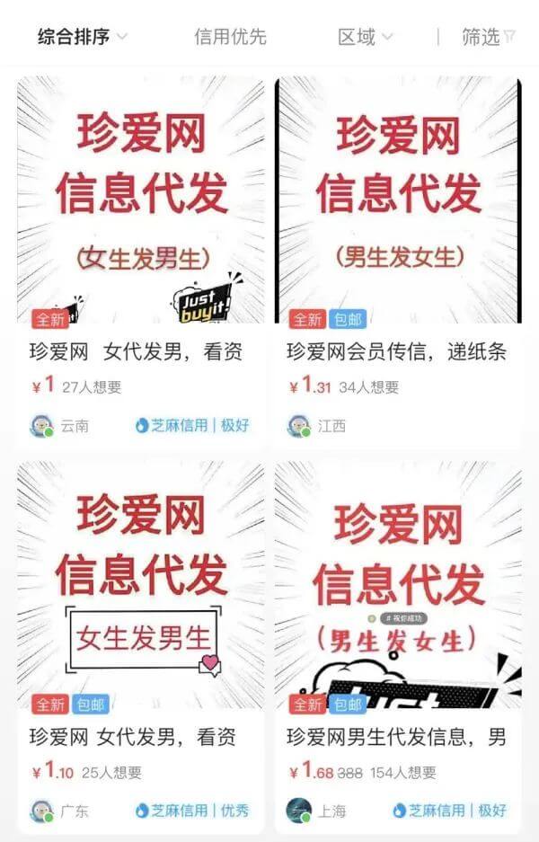 要想取得对方信任,甚至还出现了灰产。记者暗访发现,一些珍爱网信息代发服务的广告出现在了一些二手交易平台上。只需提供对方的珍爱网ID资料,卖家便可以帮忙代“撩”。卖家表示,只要有回复,就会将信息转发给记者。