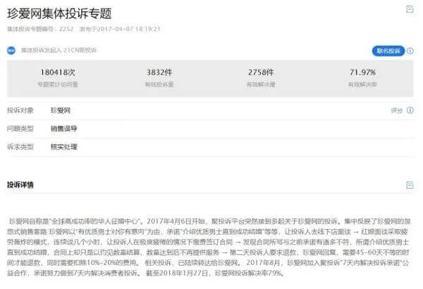 记者查询发现,在有关投诉平台上,涉及珍爱网的投诉累计超3000余条,除“要求退款”“虚假宣传”“诱导消费”等问题外,用户资质“审核不严”的问题成为客诉焦点。
