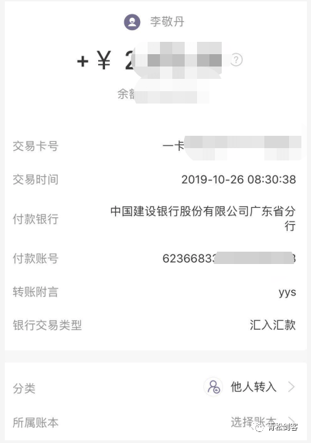2019年10月前工资通过李敬丹建设银行卡汇入,转账留言yys