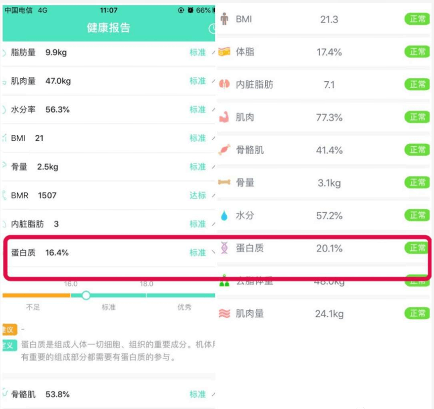 优减体脂称蓄意调低人体蛋白质含量,以达到让客户补充蛋白质,多吃优减的作用,左边为优减体脂称,右边为多锐体脂称