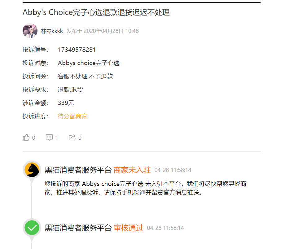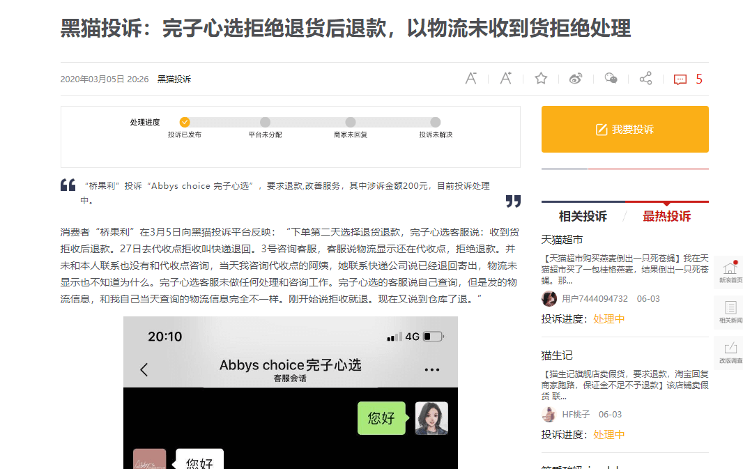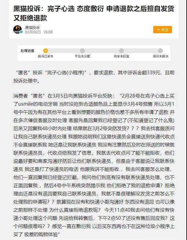 社交财经在黑猫投诉上发现,有消费者投诉,完子心选态度敷衍,申请退款之后擅自发货又拒绝退款。