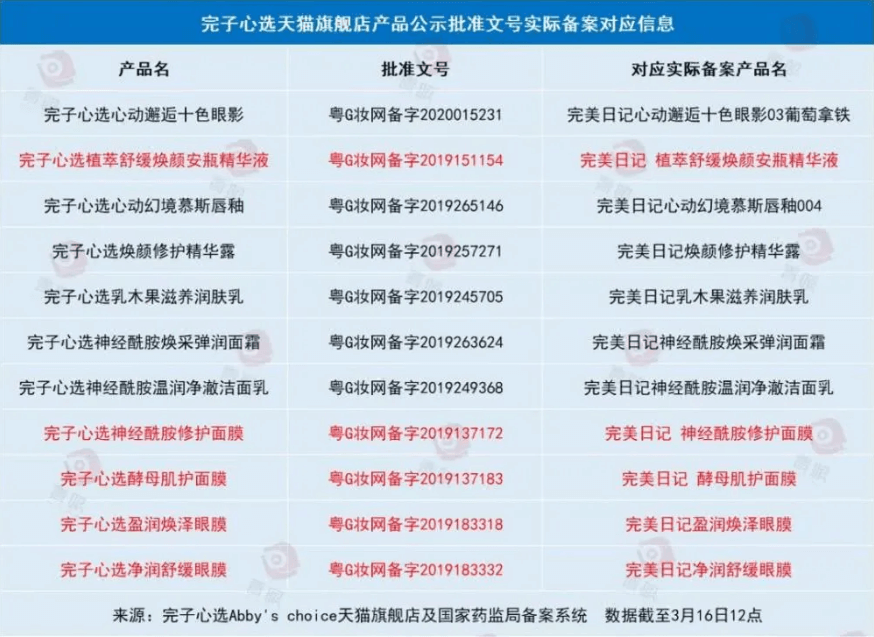 今年3月,根据《青眼》报道,完子心选备案的37个产品中,有近3成的产品备案“套用”的是完美日记的产品备案。有业内人士表示,尽管完子心选和完美日记同属于逸仙电商,但这种备案信息与产品不符的行为仍涉嫌违规。