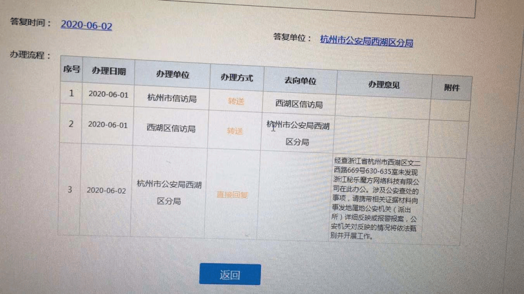 粉丝爆料,他通过举报秘乐公司诈骗一事,杭州信访局转送到了西湖区,然后其又转送到了公安局西湖区分局,公安机关出警后发现,办公地址早已人去楼空。