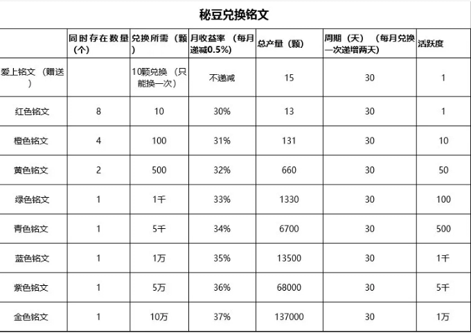 除此之外,秘乐魔方还设置了九种铭文,从低到高分别是:爱上铭文、红色、橙色、黄色、绿色、青色、蓝色、紫色铭文及金色铭文。铭文的等级越高,总数量和活跃度也越高。越高级的铭文,兑换所需秘豆越多,收益也越高。