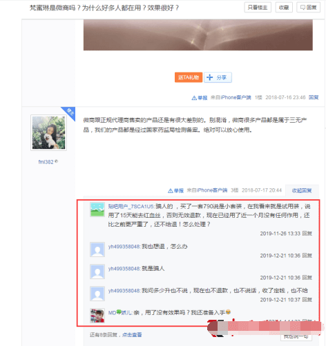 有百度贴吧的网友称,“买了一套790元说是小套装,在我看来就是试用装,说用了15天可以去红血丝,否则无效退款,现在已经用了近一个月没有任何作用,还比以前更严重了,还不给退!怎么处理?”有网友回复,“我也想退,怎么办?就是骗人,我问多少升也不说,现在也不退款也不说话,收了定钱,也不给。”目前这篇贴子已经被删除。但在其它平台,也有不少网友吐槽和质疑。