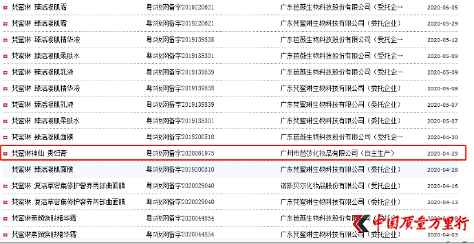 业内人士称,“集研发、生产、策划、销售于一体”,事实也并非如此。广东梵蜜琳直到2020年1月14日,才在经营项目中增加了化妆品制造,且至今该公司也未取得化妆品生产许可证,涉及广东梵蜜琳备案的化妆品,也均是以委托方的形式生产的。