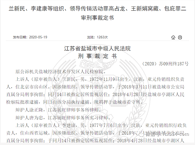 无独有偶,5月19日,中国裁判文书网公布发布“亚元”特大传销终审裁定书,累计发展会员23万余人,累计吸纳资金近8亿元。作为亚元传销组织负责人,兰新民因犯组织、领导传销活动罪,判处有期徒刑八年六个月,并处罚金人民币三百万元。