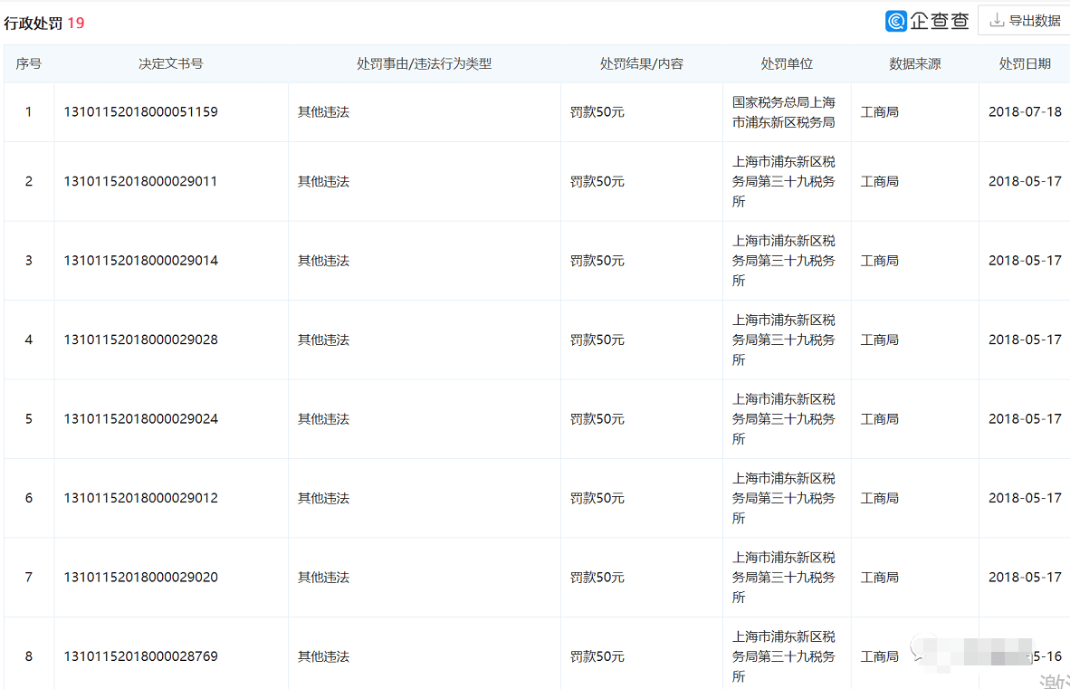 同样原因被行政处罚的还有张淑琴(张庭)任法定代表人的上海苗璇贸易有限公司。行政处罚决定文《沪监管青处字(2019)第292018006032号》显示2019年3月1日,上海市青浦区市场监督管理局对其行政处罚。