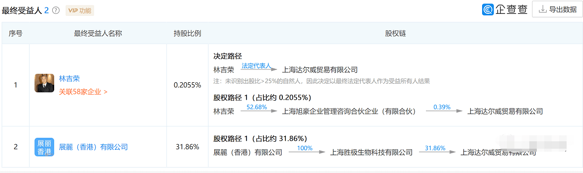 达尔威的第二大股东上海胜极生物科技有限公司持股31.86%,上海胜极生物科技有限公司的法定代表人是张淑琴(张庭),该公司先后投资15家公司,其中有13家公司为100%持股。上海胜极生物科技有限公司是展丽(香港)有限公司的全资子公司,后者是香港的私人股份有限公司,很有可能是林瑞阳(林吉荣)张庭(张淑琴)夫妇持有。