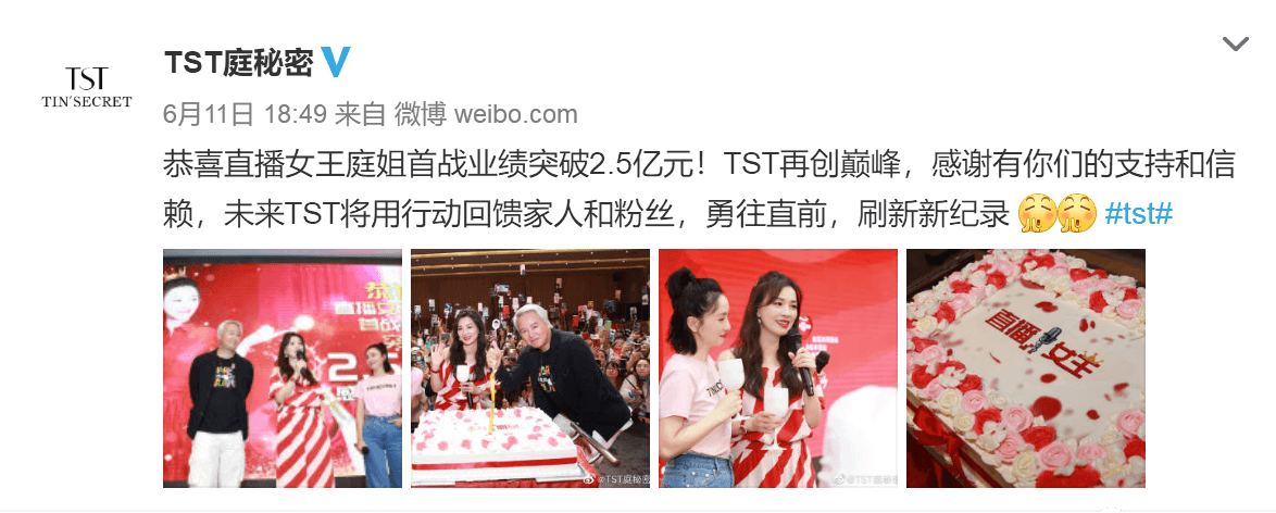 6月11日,TST母公司上海达尔威贸易有限公司(以下简称“达尔威”)认证的微博“TST庭秘密”发布微博称:“直播女王庭姐首战业绩突破2.5亿元!TST再创巅峰!”