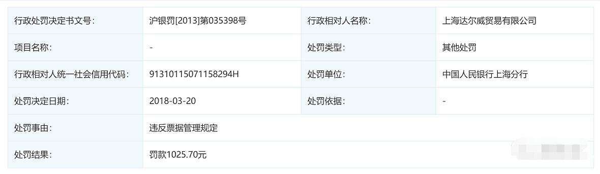 即便是快速发展的达尔威,也被中国人民银行上海分行进行了罚款。行政处罚决定文《沪银罚[2013]第035398号》显示,达尔威违反票据管理规定,在2018年3月20日被罚款1025.70元。