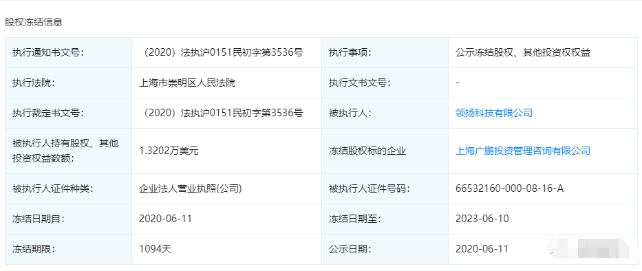 《(2020)法执沪0151民初字第3536号》执行通知书文显示:上海市崇明区人民法院对领扬科技有限公司投资的广鹏投资进行股权冻结,冻结金额为1.3202万美元,冻结日期为2020年6月11日至2023年6月10日,冻结期为1094天。