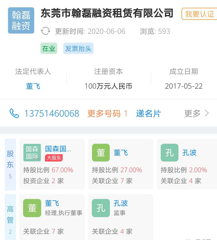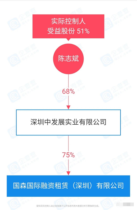 值得注意的是国森国际融资租赁(深圳)有限公司的最终实际控制人和受益人是陈志斌。陈志斌同样是广东名悦汽车集团有限公司的最大股东,持股97.5%。