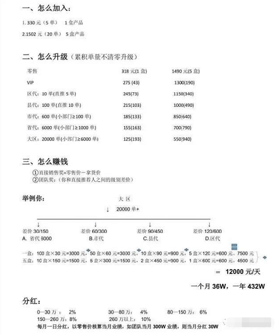 除此之外,推荐人和被推荐人的级别差越大,团队级差销售奖金越高这在扩大代理商人数的同时也免不了拉人头之嫌。