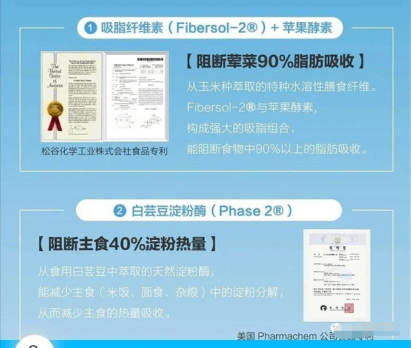 但值得注意的是,据光明新零售官方宣传资料,产品配方中有两项国际专利配方起到阻断脂肪和淀粉的作用,抗性糊精(Fibersol-2)和苹果酵素二者组合能产生“吸脂作用,阻断食物中90%以上的脂肪吸收”;白芸豆淀粉酶(Phase2)“能减少主食中40%的淀粉分解热量”。