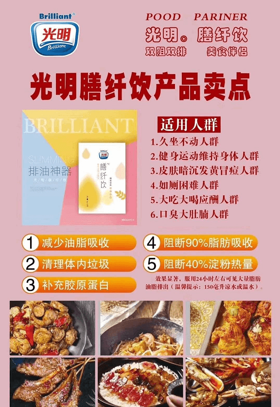 除了有娃哈哈、蒙牛之外,侦探社也注意到,光明新零售也炒得火热。宣称有“光明”的背书,以“光明膳纤饮”为主打产品,据介绍,该产品有排油、清理体内垃圾阻断90%脂肪吸收以及补充胶原蛋白并且防反弹等功效。
