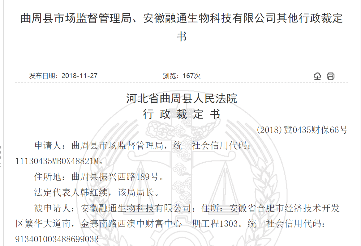 2018年11月27日,中国裁判文书网就发布《曲周县市场监督管理局、安徽融通生物科技有限公司其他行政裁定书》,该行政裁定书显示,曲周县市场监督管理局在查处被申请人安徽融通生物科技有限公司等涉嫌组织领导传销一案中,为防止被申请人转移或隐匿违法资金,申请人曲周县市场监督管理局于2018年8月20日向本院提出申请,要求对被申请人的账户予以冻结。