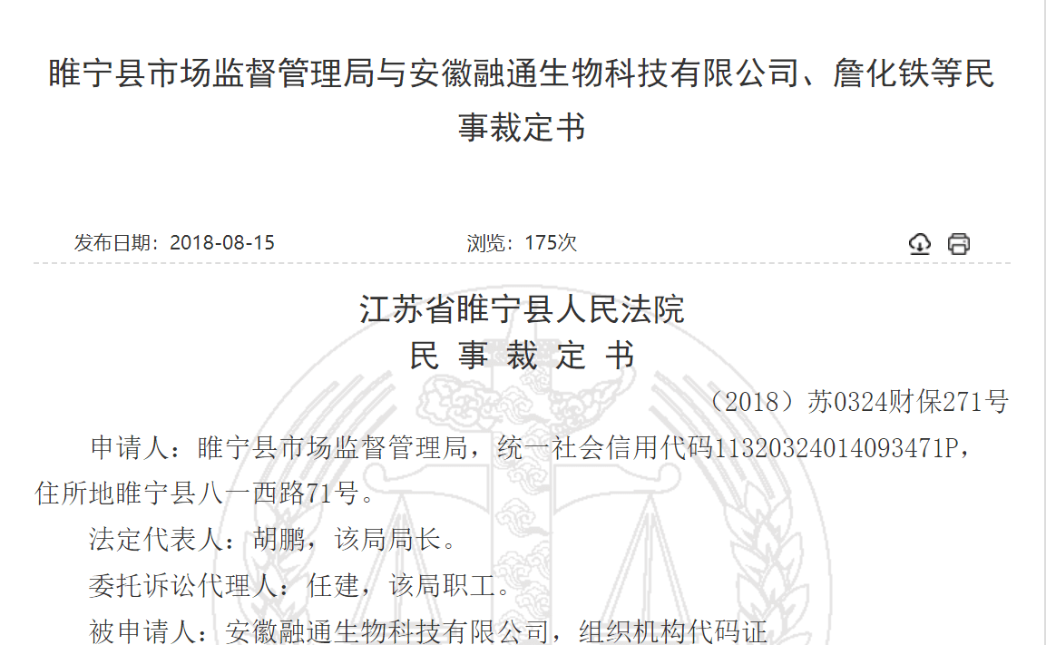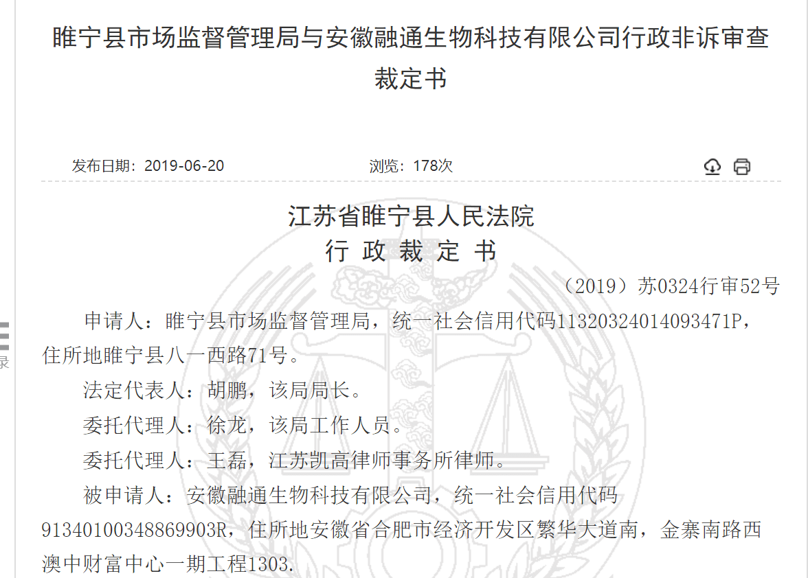 2019年6月20日,中国裁判文书网发布《睢宁县市场监督管理局与安徽融通生物科技有限公司行政非诉审查裁定书》(以下简称:《行政裁定书》)。