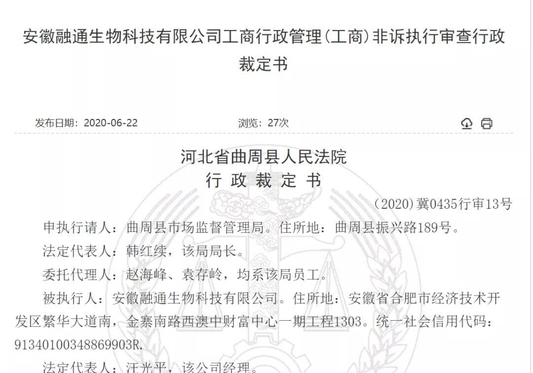 6月22日,中新观察在中国裁判文书网发现一则题为《安徽融通生物科技有限公司工商行政管理(工商)非诉执行审查行政裁定书》(以下简称:《行政裁定书》)。