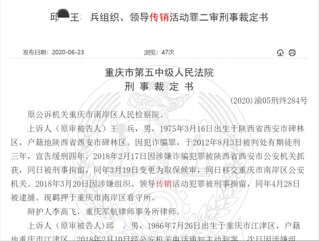 不久前,中新观察在中国裁判文书网发展一则题为《邱某王某华组织、领导传销活动罪二审刑事裁定书》(以下简称:《刑事裁定书》),该《刑事裁定书》显示,重庆市南岸区人民法院审理重庆市南岸区人民检察院指控原审被告人王某华、邱某犯组织、领导传销活动罪一案,于2019年12月26日作出(2019)渝0108刑初172号刑事判决。王某华、邱某不服,提出上诉。