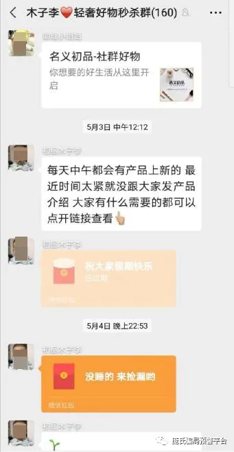 为了提升人气,“名义初品”还玩起了饥饿营销的套路,商城每天换不同的商品,在中午12点开始抢购。每次上新各团长都会在自己的微信群里面大量发布商品信息刷屏。同时,每天还以@所有人的方式,邀请群成员参加秒杀活动。