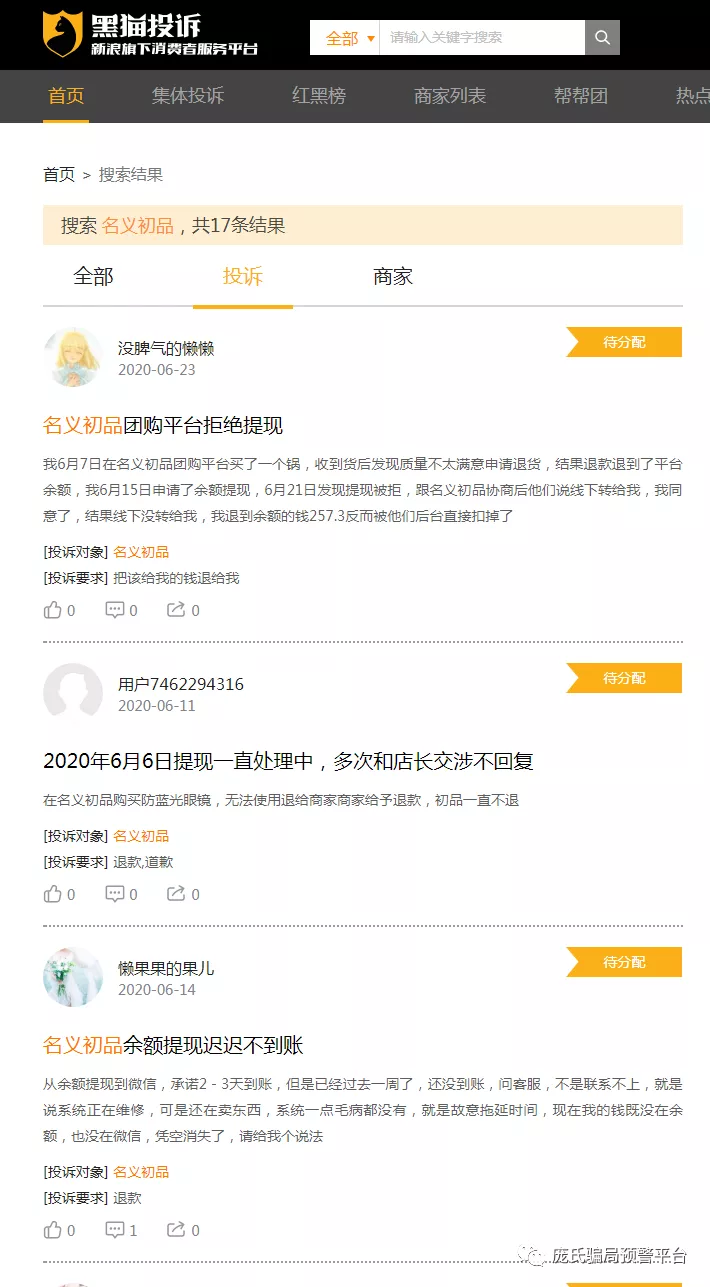 小编在黑猫投诉平台检索到多人投诉“名义初品”平台存在取消订单不退款、退货不退款、禁止提现、不发货等问题。