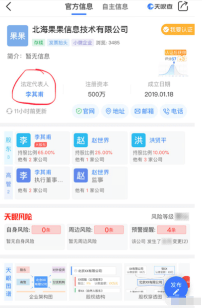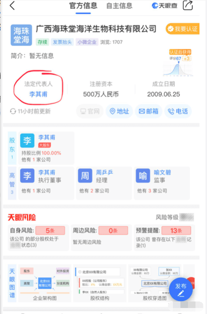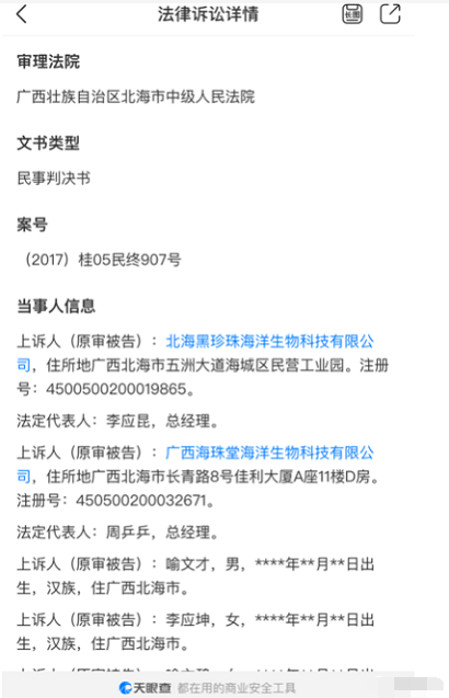 在天眼查中查询了北海果果信息科技有限公司(黑珍珠用于我们投资的系统公司)和果果公司系统里的“海珠堂”护肤品,广西海珠堂海洋生物科技有限公司,发现他们的法人都是同一个人,而这个人就是名为“李其甫”的人。