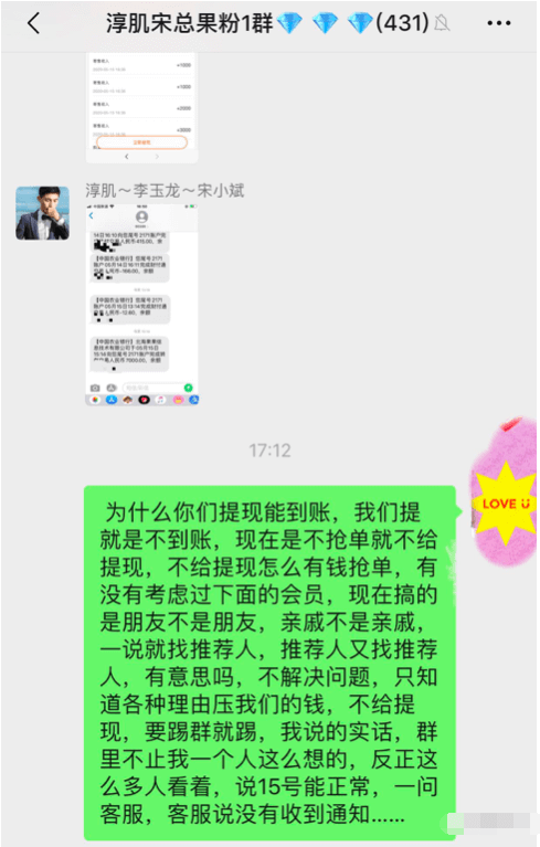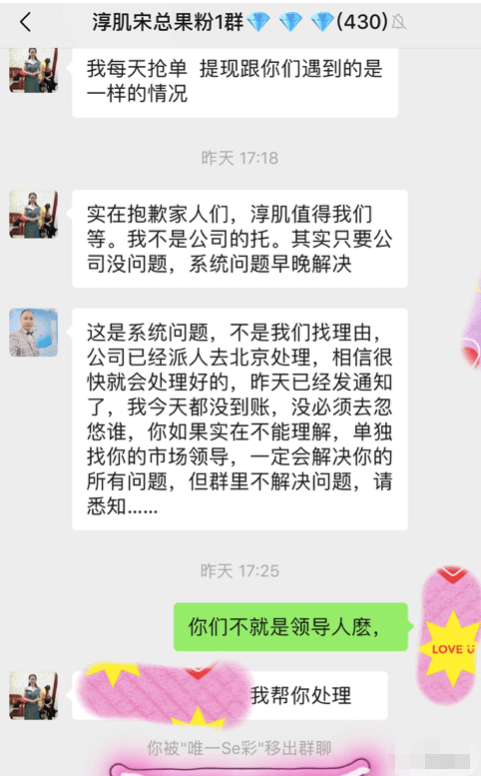 这个公告一出,系统升级完,果果里面的钱一直提现不了,每次提现都被退回,问有关负责人,总是不正面回答,说系统BAG要去北京学习,早干嘛去了,现在在学习,又是一个敷衍的鬼话,然而,总有一些人他们却能提现,在群里问,他们天天还在往系统里投钱,就能提现,于是有人在大群里问是不是你们还在投资的就能提现,而停止投资的就不能提现,说出这句话就被这冯总(冯某琼)踢出了群