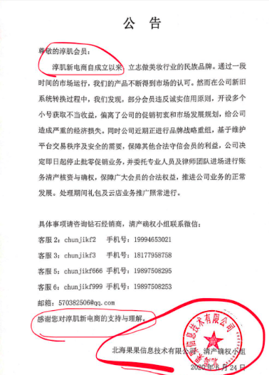 尊敬的“淳肌会员”,为什么后面是果果公司的公章,会员只有投资“海珠堂”的护肤品才有盈利,“淳肌”的是近一个月才加进去一款的,而99%的全是“海珠堂”的护肤品,而“淳肌”黑珍珠公司到处打着“政府扶持,政府力挺”的口号到处欺骗人,疯狂的进行“商业诈骗,高额套现”。