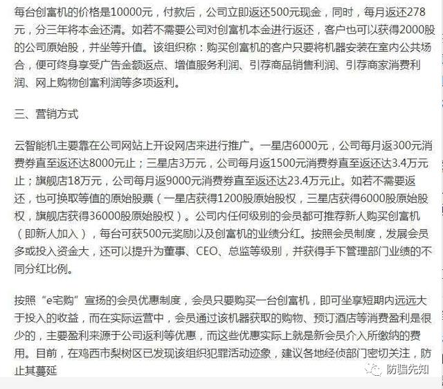 一星店6000元,公司每月返300元消费券直至返还达8000元止;三.星店3万元,公司每月返1500元消费券直至返还达3.4万元止;旗舰店18万元,公司每月返9000元消费券直至返还达23.4万元止。如若不需要返还,也可换取等值的原始股票(一 星店获得1200股原始股权,三星店获得6000股原始股权,旗舰店获得36000股原始股权)。公司内任何级别的会员都可推荐新人购买创富机(即新人加入),每台可获500元奖励以及创富机的业绩分红。按照会员制度,发展会员多或投入资金大,还可以提升为董事、CEO、总监等级别,并获得手下管理部门业绩的不同分红比例。