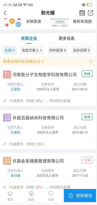 郭光耀还是河南氢分子生物医学科技有限公司、许昌百昌纳米科技有限公司、许昌金采健康管理有限公司的股东,这几个公司都是做太赫兹、氢气、肽概念的公司。