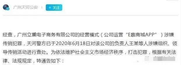 该通报显示,经查,广州立熏电子商务有限公司的经营模式(公司运营“E趣商城APP”)涉嫌传销犯罪,天河警方已于2020年6月18日对该公司的负责人王某等人涉嫌组织、领导传销活动进行查处。为依法维护社会主义市场经济秩序,打击犯罪,根据有关法律、法规规定,特通告如下: