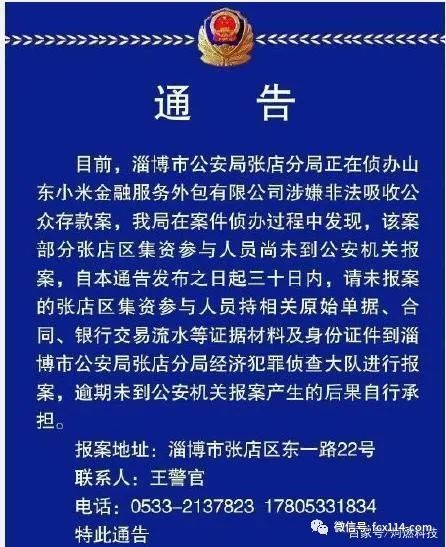 据山东省淄博市公安局张店分局发布一则通告,山东小米金融服务外包有限公司涉嫌非法吸收公众存款被立案侦办。目前在等待集资参与人员到经侦大队进行报案(投案自首)。