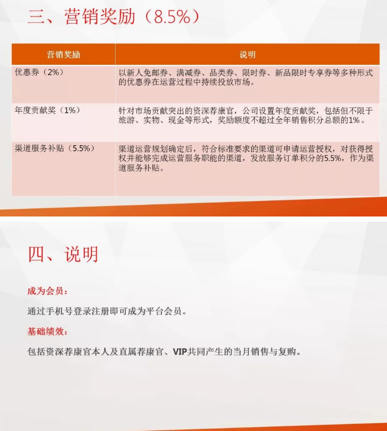在营销过程中会员还能获得2%的优惠代金券、1%的年终奖、5.5%的店补。这个“店补”是我们在地面开设了营销点,为平台增加了一个销售渠道,因此可以得到5.5%的补贴。
