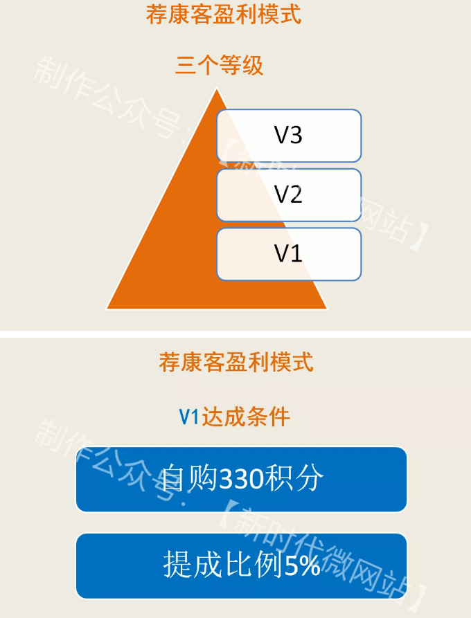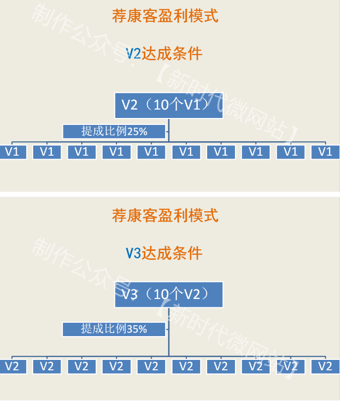 “‘荐康客’仍然采用了小单‘吸粉’的办法,只需在平台消费330元产品,即可成为平台经销商,无需任何投资、无需任何囤货、也无需办理任何手续,只需注册购物,你就成了平台主人,送你一个大型平台,所有品牌产品都属于你个人经营,这在商业史上前无古人,也很难再出现后有来者。”据相关会员表示:“‘荐康客’采用了十十复制裂变模式。平台会员分为三个等级:V1、V2、V3,当你消费了330元产品后你就是V1,最少推动十人消费后就升级为V2,十个V2再推动十人消费后你就升级为V3,以此类推当然十个V3还要继续推动更多人消费。”