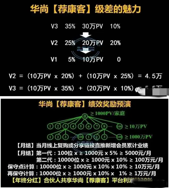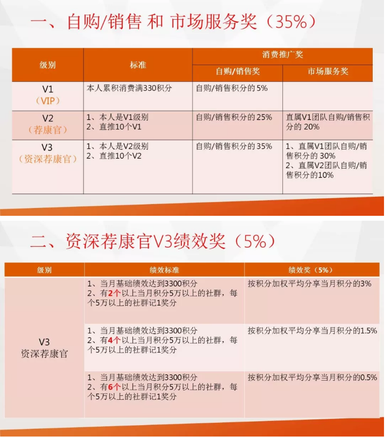 以“市场服务奖”为例,该奖分为自购回扣和销售奖励两块。自购时,根据自己级别:V1时回扣5%;V2时回扣25%;V3时回扣35%。当V1开拓市场推荐了他人消费,就会得到销售奖。按照自购回扣(提成)比例,V1推荐了新人消费,这个新人就进入了(第二层)V2行列,每推荐1个新人消费就能得到20%提成。因为我们要减去新到客户(V1)的5%,25%-5%=20%;当V2行列(无论什么人)推荐了新人消费,新人就进入了(第三层)V3行列,但V2行列的人推荐的新人不属于我们直推,就得把25%的奖励让给V2行列,我们能得到V3行列的10%奖励,35%-25%=10%。