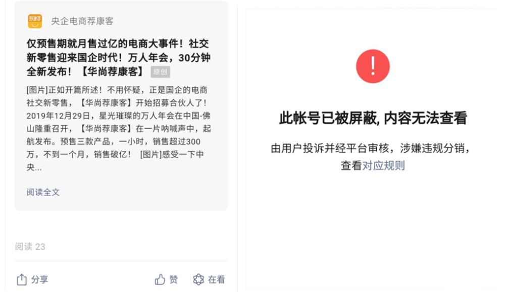 而在微信公众号名为“央企电商荐康客”上,一篇题为《仅预售期就月售过亿的电商大事件!社交新零售迎来国企时代!万人年会,30分钟全新发布!【华尚荐康客】》文章被微信运营方以“此账号已被屏蔽,内容无法查看”,理由是“由用户投诉并经平台审核,涉嫌违规分销”。