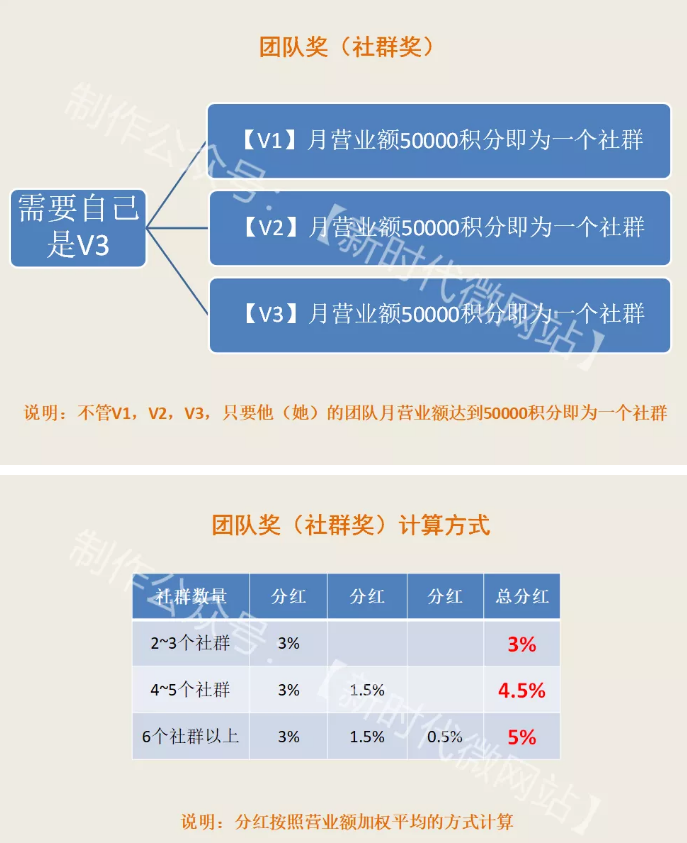 除了以上奖励,还有“培育奖”,当我们培育了V2或V3市场,两个行列各自都最少有十人消费,我们就升级到了V3级别,每月业绩最少不低于销售额3300元,平台会发给“绩效奖”。如果下面的团队中,有两个团队各销售了5万元,得到3%的绩效奖;当四个团队各销售了5万元,增加1.5%的绩效奖;当六个团队各销售了5万元,再增加0.5%的绩效奖。