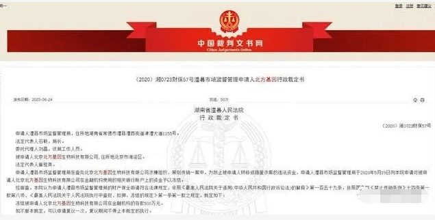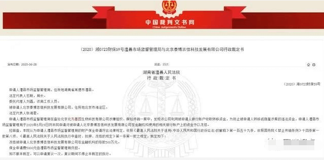 据裁判文书网披露,申请人湖南省常德市澧县市场监督管理局在查处北方基因公司涉嫌组织、策划传销一案中,为防止被申请人转移或隐匿涉案的违法资金,于2020年5月19日向湖南省澧县人民法院申请对被申请人北方基因公司在金融机构使用的相关银行账户上的资金予以冻结。