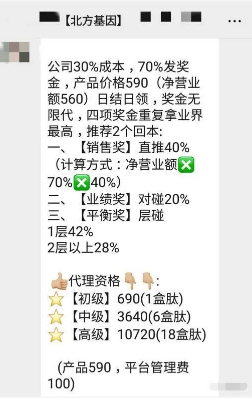 闫姓经销商向本网介绍,690元认购1盒肽成为北方基因初级代理、3640元认购6盒肽为中级代理,10720元认购18盒肽为高级代理,推荐2个代理就可回本。奖金有销售奖(直推奖)利润的40%(净营业额×70%×40%);业绩奖(对碰)可拿利润的20%;平衡奖(层碰奖)可拿首层利润的42%,2层以上可拿利润的28%。