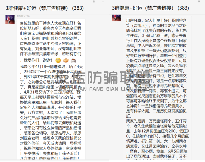 真有这么神奇的事吗?据反传防骗联盟通过这段时间在群内的观察,该微信群主要宣传“能量金字塔”的“神奇功效”,每天都有不少人在群内分享自己“请塔”后或疾病康复、或月入数万的事迹,在这群人眼中,“能量金字塔”俨然就是一个“黑科技”。